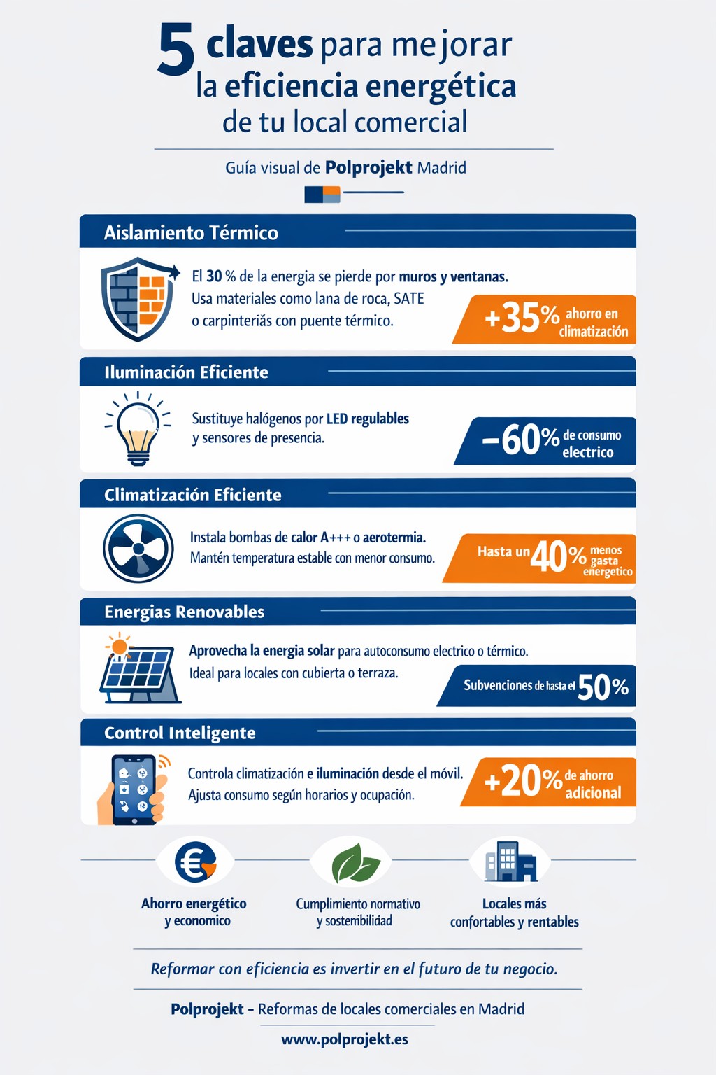 En Polprojekt integramos todas estas ventajas en un proceso de reforma global, combinando diseño, técnica y eficiencia para que tu local sea más competitivo, cómodo y sostenible.